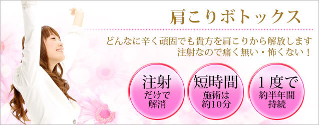 オリジナルで肩こり地用メニューがあるクリニック。値段は使用する薬剤によってピンキリです。一番安くて数千円から可能ですが効果持続などは値段通りと考えたほうがよさそうです。 半永久的に肩こりから逃れたいならボトックス注射です。